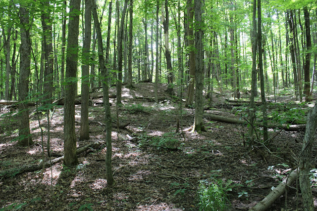 These two trails are nestled, with the first and last parts overlapping. The shared sections of trails are in mixed forests, with hemlocks along the streams and hardwoods elsewhere. After about half a mile, near the unmarked junction where we headed back last time, there is a lean-to nestled in the woods off the trail. Frankie was eager to check it out, so we stopped for a rest and snack. From here on out was new territory for him on his own power, as we were last here with the Kelty carrier. At the marked intersection, the Crossover turns back while the North Rim continues an additional mile through successional old fields and young forests before reconnecting again. The fields were beautiful with riots of color from the flowers and sky, but of course a bit warmer with the exposure. Despite his contrarian claims to love hot weather (which I most certainly do NOT), Frankie was eager to get back in the woods.