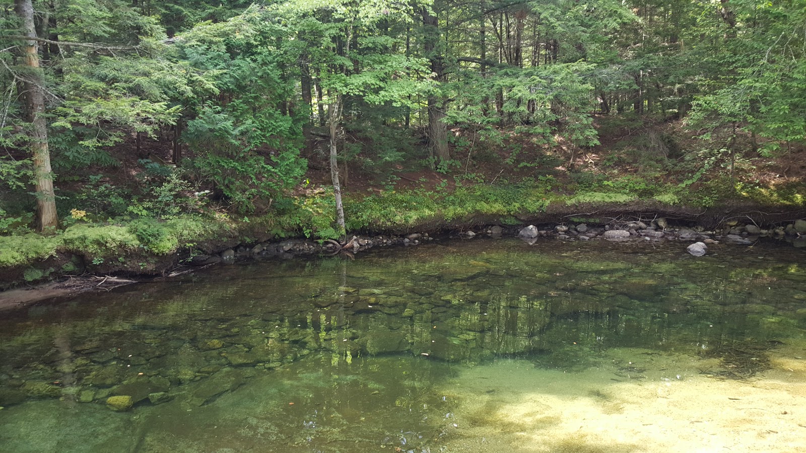 However, the description in the trail guide is focused on the route up Grace, and contains scant details about the swimming. I looked online and determined that we wanted to find a long, narrow pool with extremely deep water, somewhere in the range of 0.5-1.0 mile south of Route 73 along the North Fork of the Boquet River. The group was excited to explore a new area, so we embarked. It was easy to find parking, as there are several wide pull-offs on both sides of the stone bridge. We started along the right bank of the river, as indicated in the trail guide, following behind a large group lugging pool noodles and other assorted floating things. We breathed a huge sigh of relief when they stopped at the first large swimming hole just up the trail, taking their inflatables with them.