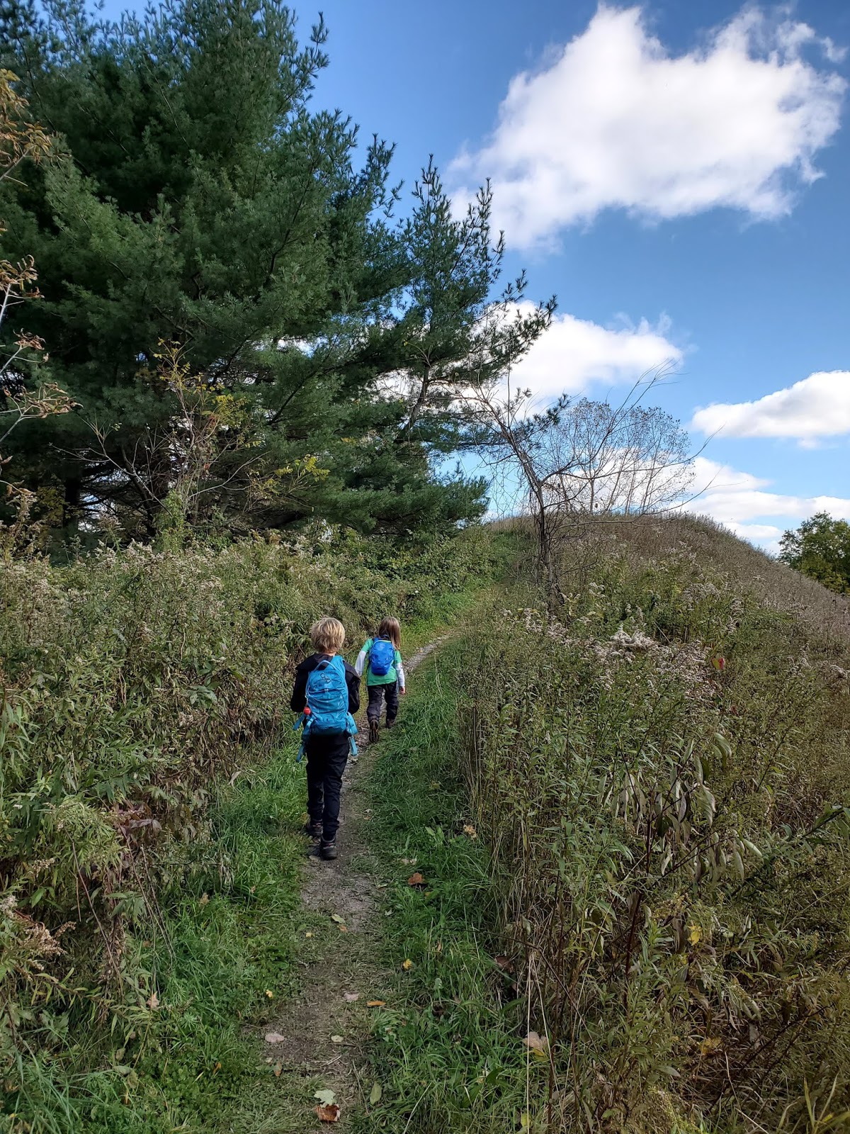 From the lower parking lot, there are two trailheads. We took the right fork onto the Field to Forest Trail, which climbs over a low forested ridge then crosses a field. The trail consists of a mowed grass strip through goldenrod and milkweed. We passed an unmarked split and wondered about it, but kept going as planned.