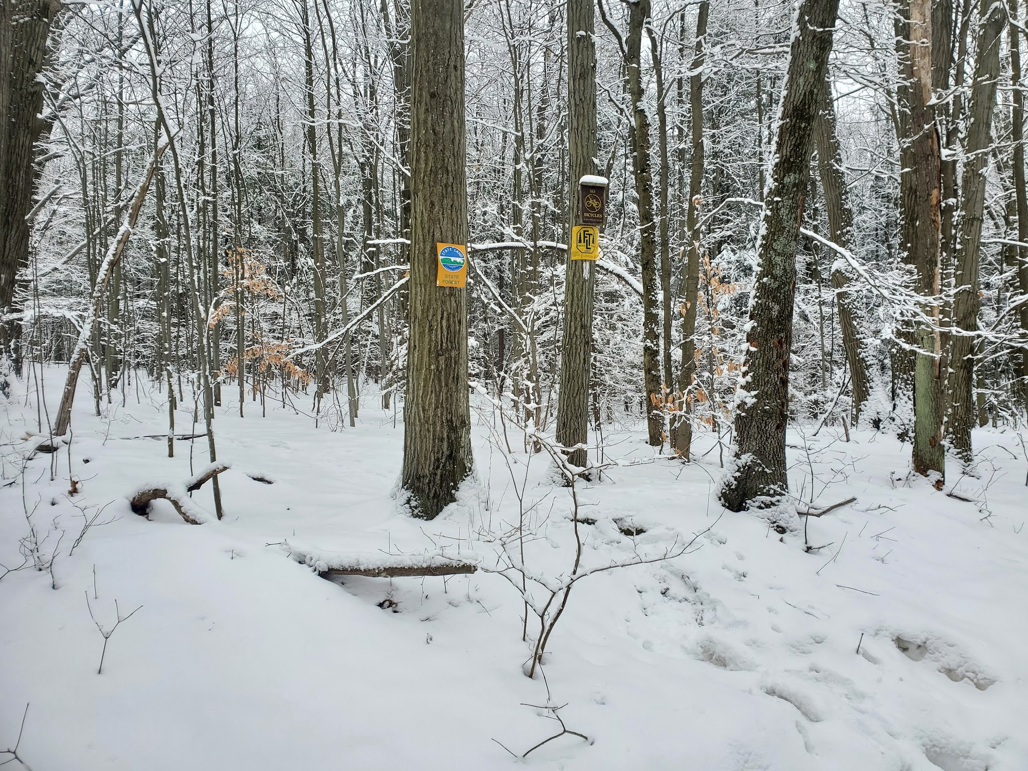 Once back at my car, I drove south a few miles to Comfort Road, which the FLT follows for approximately 1 mile between two trailheads that I used for two short hikes back in September. I would have liked to just hike this at that time, making the two shorter hikes one longer hike, but I wouldn't have made it back in time for school pick up, so I skipped the roadwalk, knowing I'd be back for the Townline Road section and could get it then. The northern of the two trailheads leads west onto private land (image immediately below). There was a gorgeous dusting of snow coating every surface up here and it was pretty magical for a roadwalk (cover image).