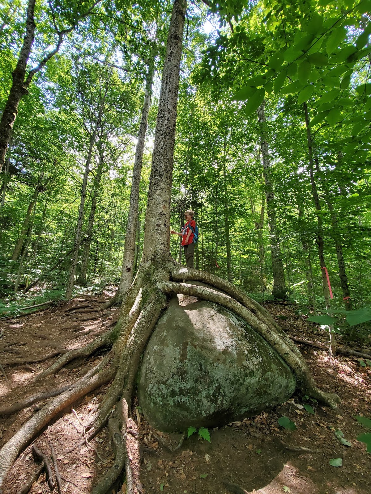 This is a fairly easy hike, as a lot of work has gone into design and maintenance of the trail. Switchbacks ease the grade, drainage structures are in good order, and stairs and bridges provide both function and fun. The trail starts by heading west, roughly parallel to Route 28N, moving slowly uphill and away from it. The sight and sound of the road through the trees is a little distracting at first, but once the trail turns south, 28N is quickly forgotten.